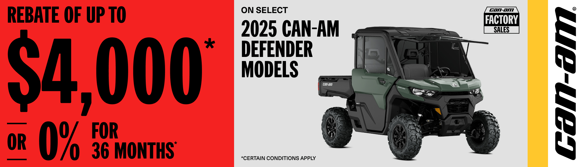 Rebate of up to $4,000 or 0% for 36 months on select 2025 Can-Am Defender models