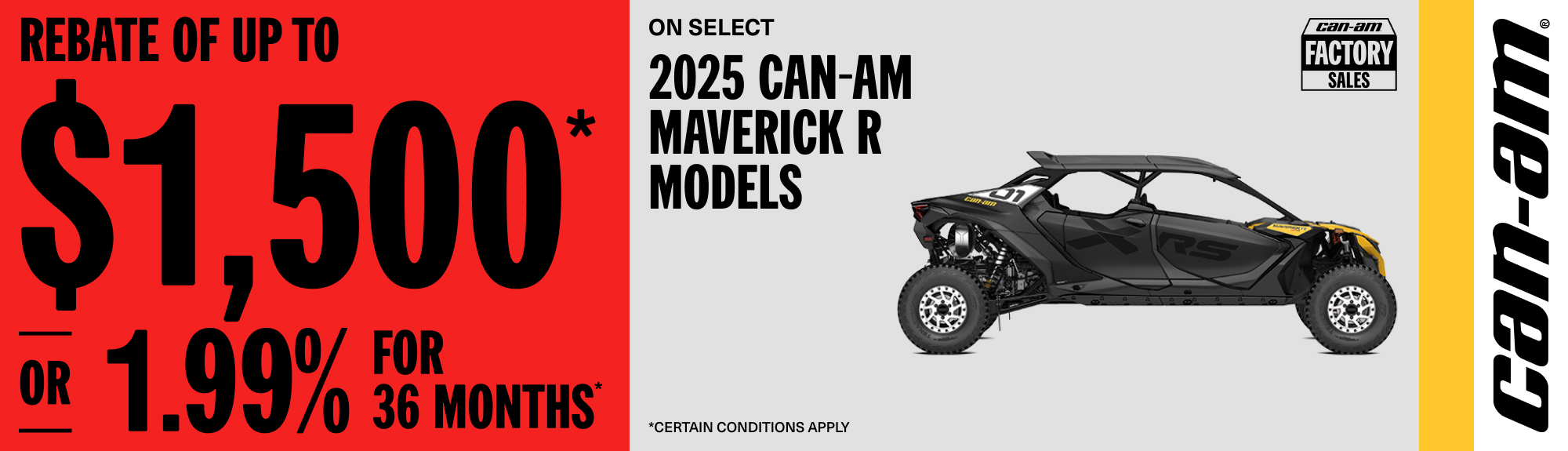 Rebate of up to $1,500 or 1.99% for 36 months on select 2025 Can-Am Maverick R models