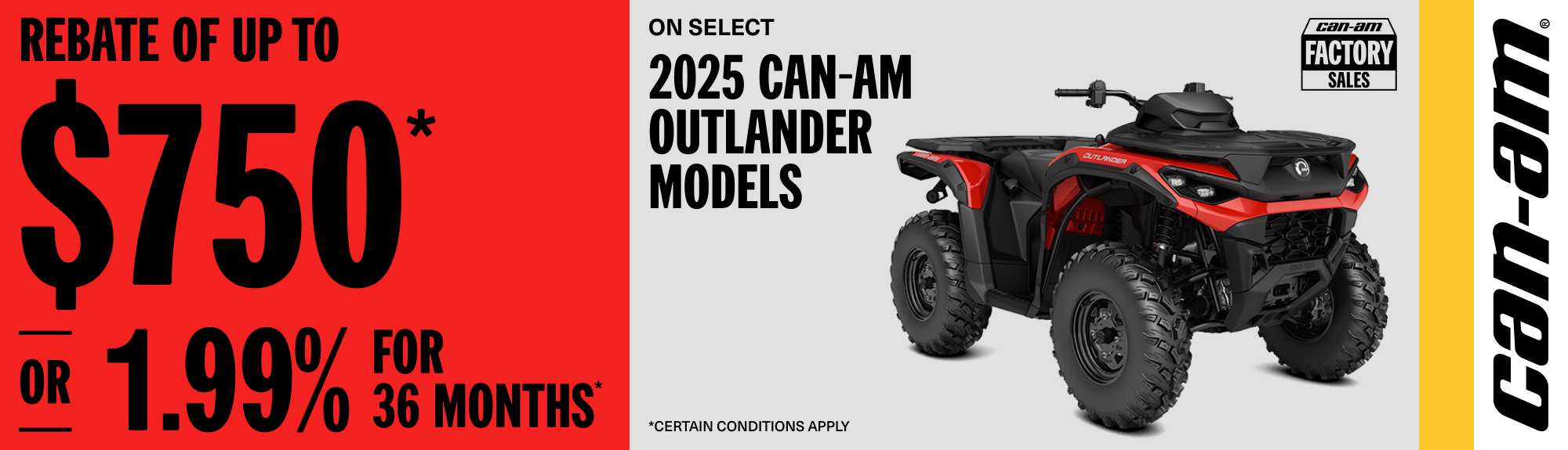 Rebate of up to $750 or 1.99% for 36 months on select 2025 Can-Am Outlander models